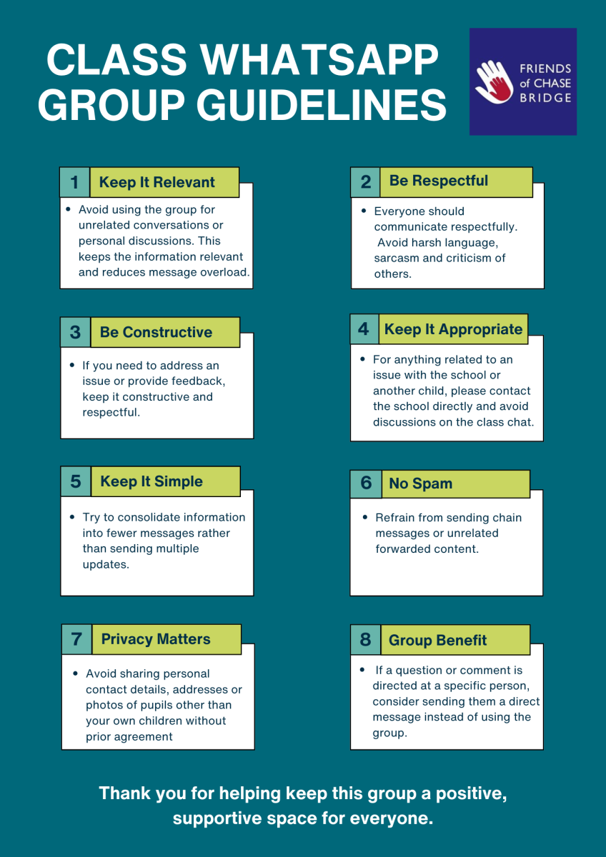 To keep them positive, respectful and useful for everyone, please take a moment to read and follow the Class WhatsApp Guidelines, which can be found